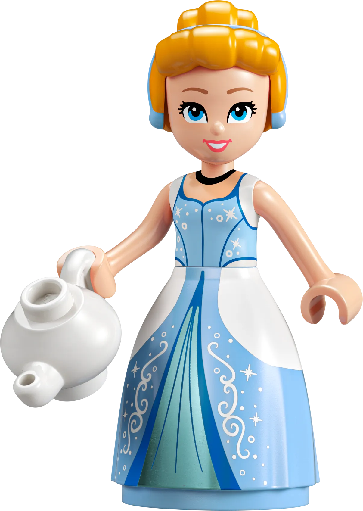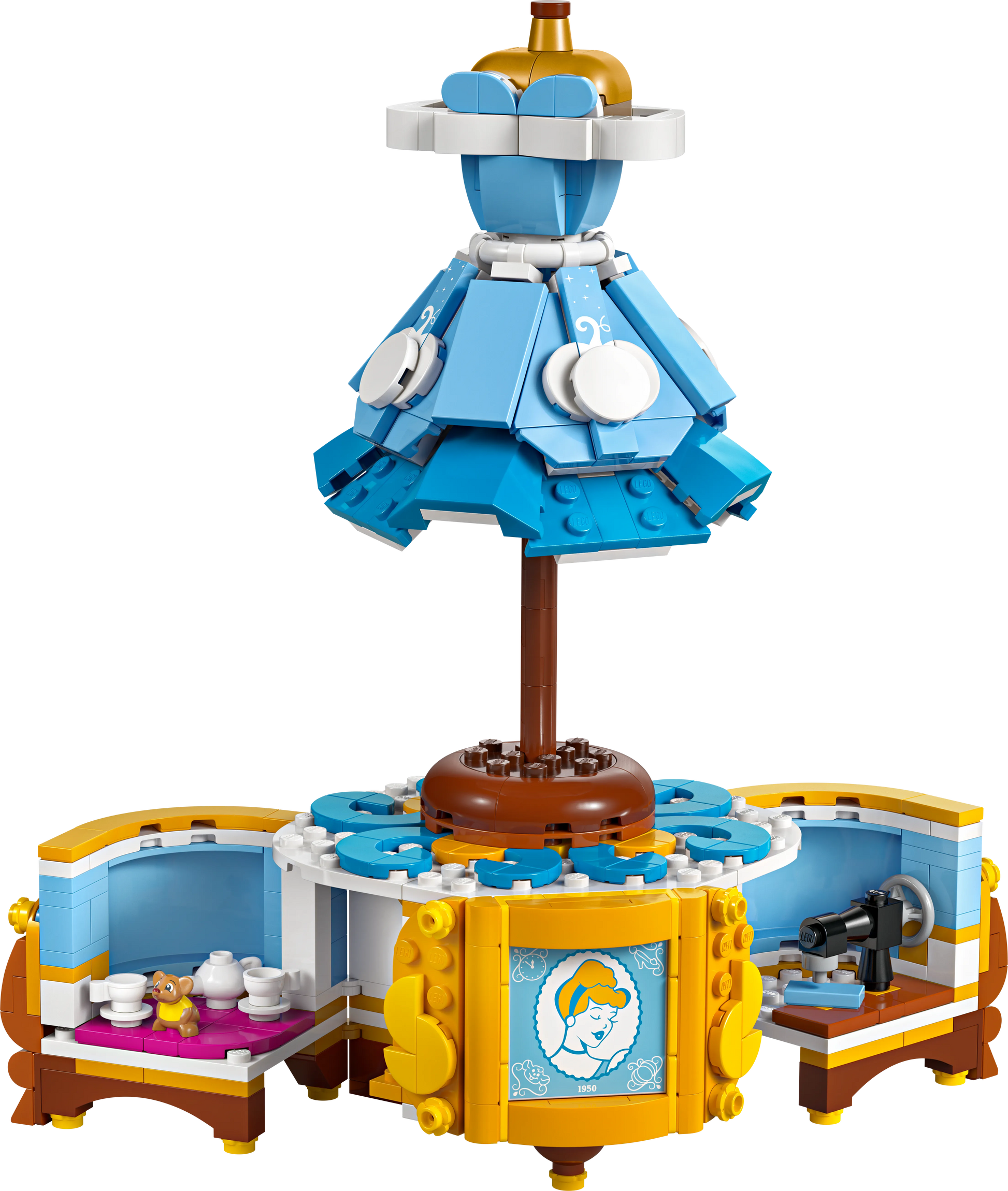- Een iconische jurk in LEGO-vorm: Bouw een replica van Assepoesters prachtige baljurk, compleet met een lichtblauwe rok, een korset en een tiara. De jurk is voorzien van talloze details, zoals glittersteentjes en een elegante bloemenprint.